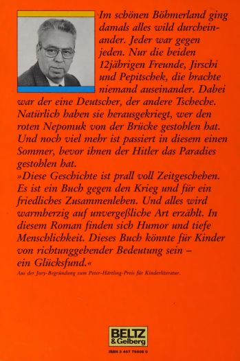 In the beautiful region of Bohemia, everything was wildly mixed up at that time. Everyone was against everyone. Even so, no one could separate the two 12-year-old friends, Jirschi and Pepitschek One was German, the other Czech. Of course, they found out who stole the red Nepomuk from the bridge. And a lot more happened in this one summer before Hitler stole paradise from them.