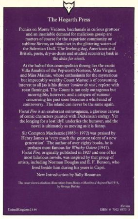 It is an understandable weakness in young writers and a deplorable propensity in famous ones, to become personally verbose at the expense of the story. Both classes talk too much themselves and let their characters talk too little. Compton Mackenzie, who long ago won his laurels with "Sinister Street" and "Carnival," is unfortunately indulging himself in the prerogative of fame. In "Vestal Fire" he has a good story to unfold. It is a study in the disintegration of a colony of Americans and Europeans on a pleasant island in the Bay of Naples, brought about by the intrusion of an exotic French nobleman with Hellenic ideas. The book is worth reading, because Compton Mackenzie wrote it. Even at his worst there is a remarkable glamour about his style. But he very nearly ruins it by his tendency to write as though the story were being read aloud, while he stood by and interposed comments on the plot and added characterizations of the people in the story, of his own. With a classical island for a setting, the story is garlanded in classical quotations and allusions, but though the theme is itself rather classical, the point of view and the manner of telling are entirely British. Sirene is an island owned by Italy, which has gradually become a social league of nations, as foreigners who came to it for a week or two in the course of their travels have stayed on and settled, building themselves villas according to their means, with such flowery names as the Villa Decamerone, the Villa Amabile, the Villa Paradiso, the Villa Hylas, or the Villa Parnasso. English, French, Russians, Americans and Italians to varying degrees, they are living together in harmony when the story opens. In fact, the polite population of the island is about to honor a custom which has become a rite: Sunday afternoon tea at the Villa Amabile, the home of the Pepworth-Nortons. It is about the Pepworth-Nortons that the story revolves, and all the storms and stresses that are to come. There are two kindly spinsters, Miss Virginia Norton and Miss Mamie Pepworth-or perhaps it is the other way around-who have bracketed their names and devoted the afternoon of their lives after a long morning in Idaho to dispensing hospitality in Sirene. It is something more accurate than a figure of speech to say that the name of their friends is legion. The book is practically teeming with characters, and each one is portrayed at length. Mr. Mackenzie seems to have collected the acquaintances of a lifetime in this book. Whenever a new person is introduced to the story he pauses and delivers himself of a short biography of that person. These characterizations are written with the bright wit of malice and some of them are rather entertaining. But there are too many. Count Marnac, who is the villain of the piece, comes to Sirene at the invitation of the Pepworth-Nortons, who met him and were charmed by his gracious manners while on a classical pilgrimage. Every one on the island who is of any importance has been apprised of his coming. They have heard that he is extremely wealthy and charming. So they are all there to meet him at the Pepworth-Nortons. He is an instantaneous success on the island, from the moment of his arrival, accompanied by a handsome boy named Carlo-whose place in the story assumes a questionable aspect, soon enough. Count Marsac decides that he will live in Sirene. He will build himself a villa and meantime he will live in a rented one. There he gives elaborate entertainments of the most exotic sort, while the magnificent Ville Hylas is being built for him. Then, gradually, the poison in the story begins to work. There are stories about Marsac's androgynous propensities. Sirene is tolerant, though, and nothing is done. But other forces of dissension are at work. Some one discovers that the Count has a past. And the outcome is that Sirene is divided forever into two warring camps. As the years go on, the conflict becomes more and more bitter. It is a long conflict, beginning more than a decade before the war and lasting through it.