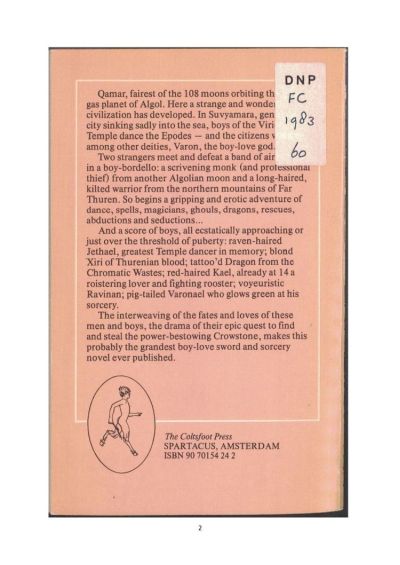 The interweaving of the fates and loves of these men and boys, the drama of their epic quest to find and steal the power-bestowing Crowstone, makes this probably the grandest boy-love sword and sorcery novel ever published.